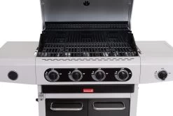 De Barbecook Siesta 412 is de ideale buitenkeuken voor feestjes. Deze barbecue beschikt over een enorm kookoppervlak waar voor maximaal 14 personen op gegrilld of gebakken kan worden. De Siesta heeft een driedelig gietijzeren grillrooster dat dankzij de hoge temperatuur voor echte grillmarks in het vlees kan zorgen. Deze buitenkeuken van Barbecook kom je bovendien nooit ruimte te kort. De vier krachtige branders zijn traploos regelbaar en zorgen ervoor dat de grillroosters snel op temperatuur zijn. Dankzij de elektronische ontsteking kunnen de branders bovendien met één druk op de knop geactiveerd worden.