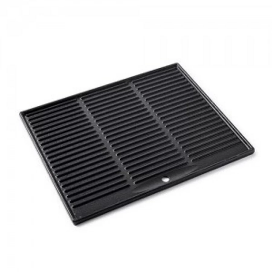 Geëmailleerde gietijzeren contactplaat met geribbelde en vlakke zijde om te grillen à la plancha.