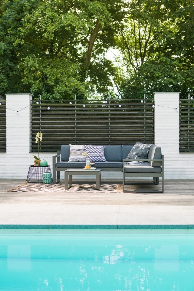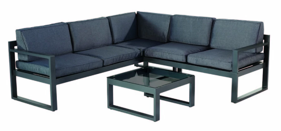 De Hartman Perpignan loungeset is geheel van aluminium daardoor is het roestvrij en weerbestendig. De set heeft een zeer strakke uitstraling in een mooie grijze kleur. Wil je liever languit liggen klap dan het linker zitgedeelte omhoog zodat je iets hoger ligt en ultiem kunt genieten. Deze set is compleet met tafel.