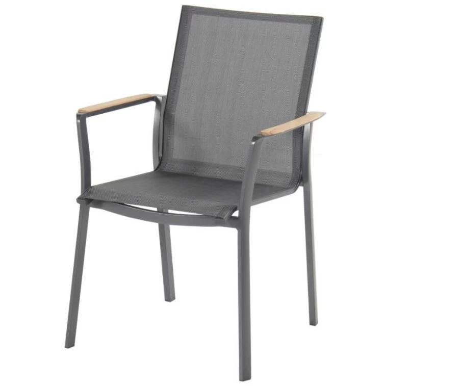 Een rond aluminium frame met een teak detail op de armleggers. Dit geeft een twist aan deze Galicia tuinstoel. Het zit- en ruggedeelte van de stoel zijn van hoogwaardig textileen. Door het teakhouten detail is deze stoel ook goed te combineren met een tafel met een teak top.