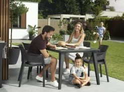 De Elisa tuinstoel van Keter in grafietkleur is een eigentijdse stoel met royale rug- en armleuningen voor extra zitcomfort. De stoel is licht van gewicht en handig stapelbaar voor plaatsbesparend opbergen, zodat je eindeloos kunt genieten van lange zomerdagen.