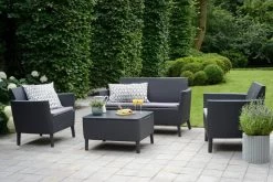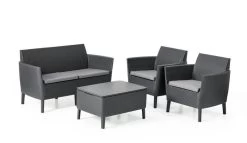 - De set bestaat uit een tweezitsbank en twee stoelen met zachte kussens en biedt comfortabel plaats aan vier personen.