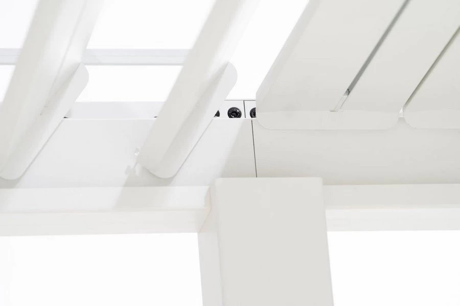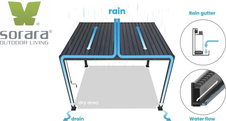 Het unieke kantelbare lamellendak van de SORARA Mirador Pergola biedt vele mogelijkheden voor bescherming tegen zon, regen en wind. Wanneer de lamellen gesloten zijn, is het dak volledig waterafstotend. Het water wordt direct gecontroleerd afgevoerd via het innovatieve geïntegreerde waterafvoersysteem.