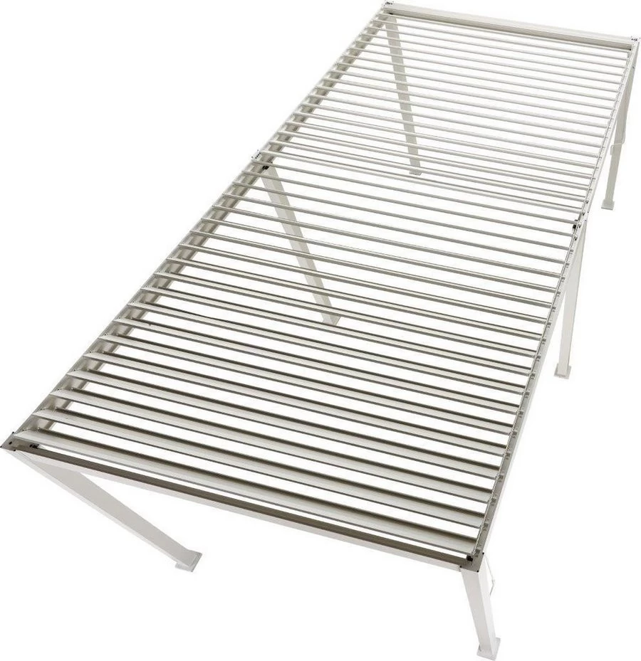 - Materiaal: Aluminium frame en stalen lamellen.